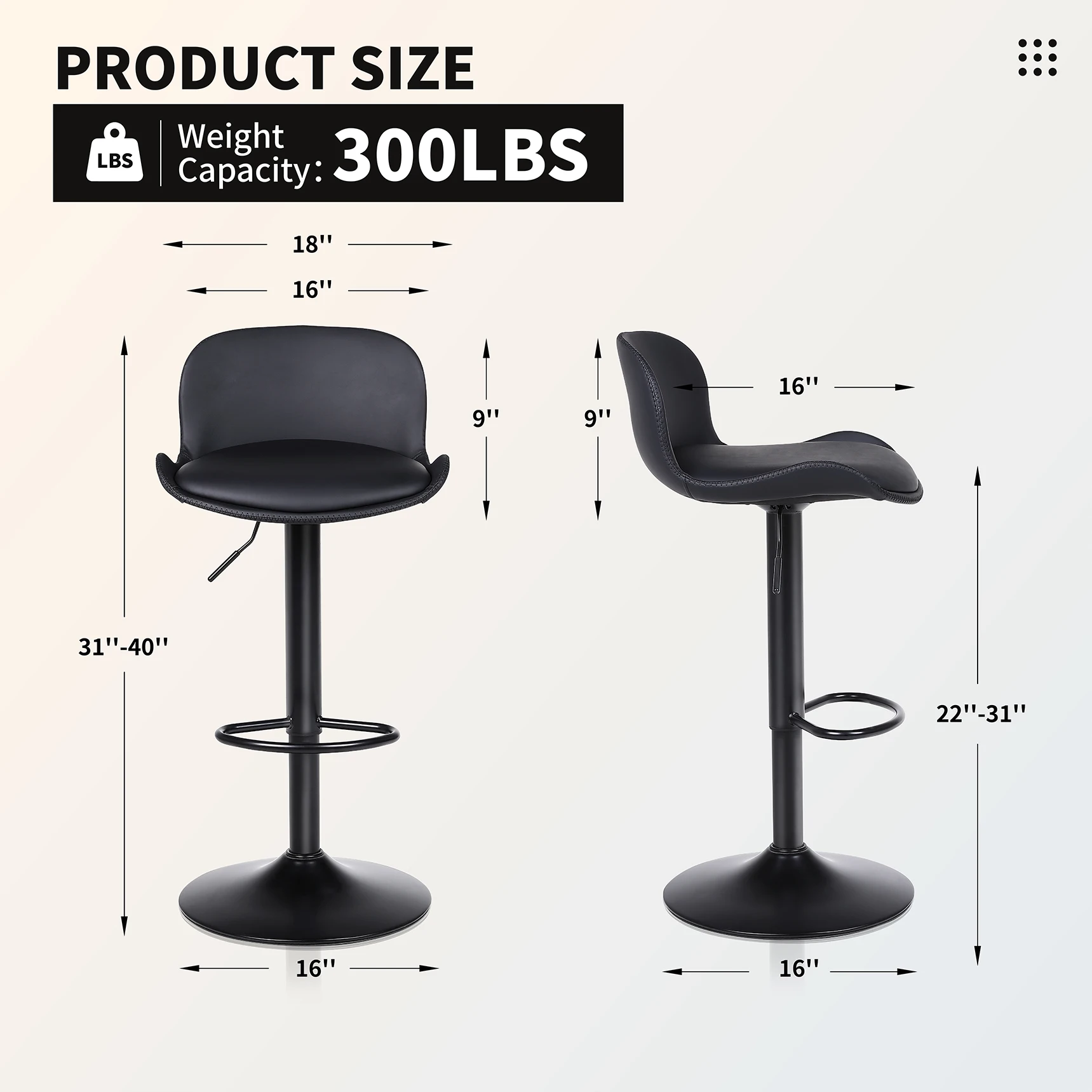 Sturdy construction and durability: The metal frame and enlarged base ensure stability, strength and durability of the adjustable barstool. A non-slip ring under the foot provides additional stability, protects the floor from scratches and reduces noise when moving.