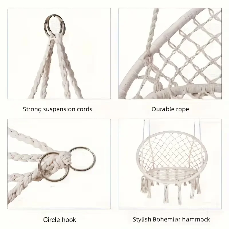 The chair features a handwoven cotton rope design, offering a unique and bohemian aesthetic for your outdoor space.