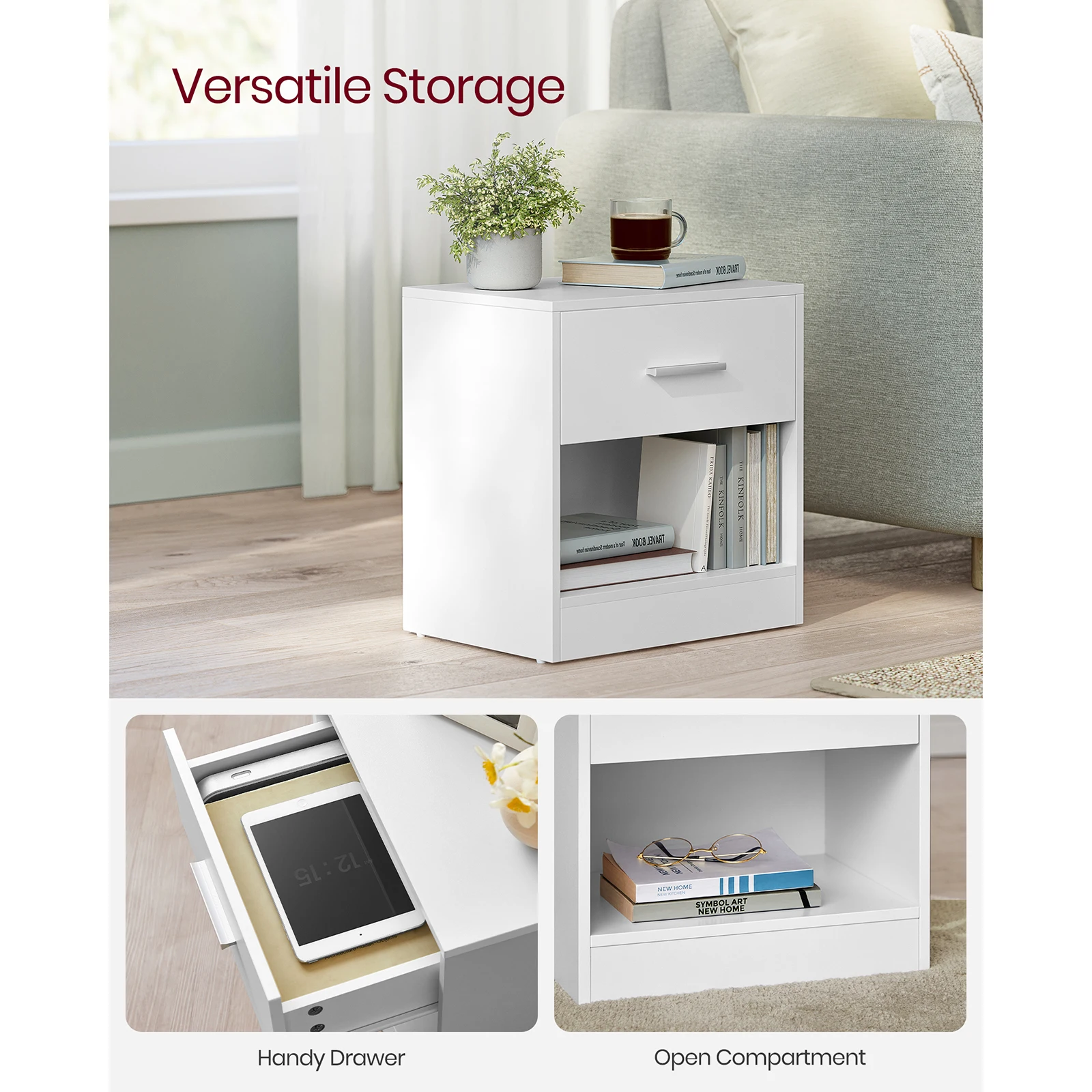 [Sturdy & Stable] Durable particleboard, high-quality fittings, and a robust structure give each side table high stability. It can hold up to 75 kg in total, and the drawer holds up to 5 kg