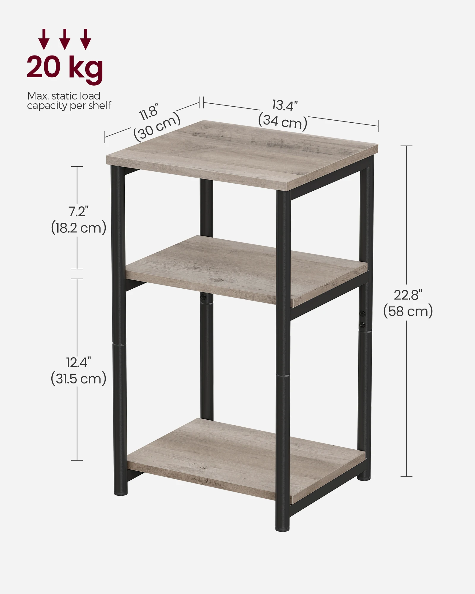 – Max. Static Load Capacity per Tier: 20 kg (44 lb)