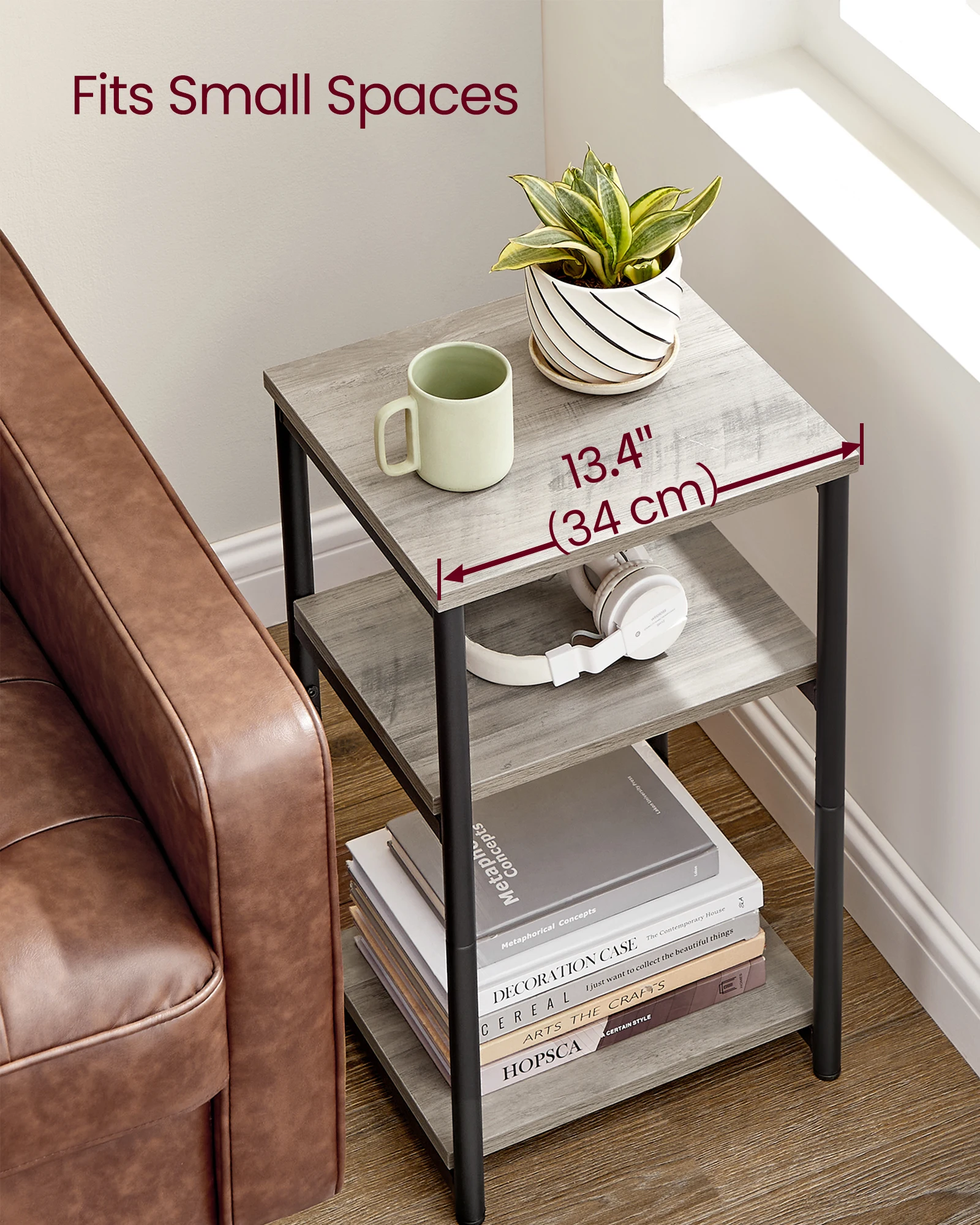 [Fits Small Spaces] This small table, sized 30 x 34 x 58 cm, easily fits the gaps between your couches or tight spots beside your bed